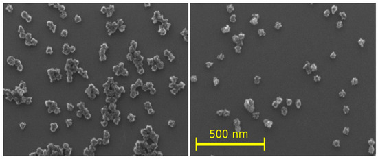 The liquid- and solid-state NMR experiments show that the NPs consist of a densely cross-linked insoluble fraction and a soluble fraction. Using SEM, the sizes of the as-deposited NPs, and those after dissolution in the tested solvents and subsequent drying, were measured (an example is shown in Figure 8). Images of the NPs prepared at different powers and dissolved in different solvents are presented in Figure S3. The sizes of N40, N60, and N80 in acetic acid and of N60 in different solvents did not differ significantly from the as-deposited state and were around 44 ± 2 nm (Figure S3 and Table S2 in the Supplementary Materials). The NPs have a cauliflower structure and the size has a relative error of about 5%, comparable to the difference in the values.