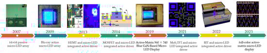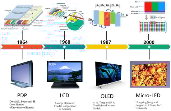 Micro-LED technology was firstly proposed by Prof. Jiang and Prof. Lin in Texas Tech University. Generally, it is widely accepted that micro-LEDs do not exceed 50 microns in size. For different display applications, there are two main trends. One of the directions is that which Sony is focusing on, which is small-pitch, high-resolution, large-size indoor/outdoor displays. The other is the wearable devices (such as AR/VR and Watch) launched by Apple, which require high resolution, portability, low power consumption, and high brightness. It is important to make the use of the many advantages of micro-LEDs: fast response time, high brightness, wide viewing angle, high dynamic range, low power consumption, and long lifetime. The history of display technology is shown in Figure 1.
