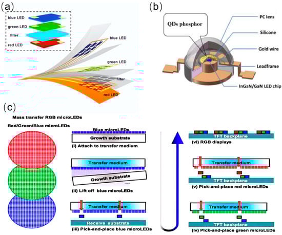 Three-color stacking: The three-color stacking technology achieves the full color display by controlling each vertically stacked red, green, and blue micro-LED, as shown in Figure 2a. The stacking structure allows individual pixels to occupy less space, thereby achieving a higher pixel density per unit area, meeting the requirements for application in small-size micro-display devices and also having wide applications in the display field [,,]. Therefore, it is considered to be one of the key technologies for achieving high resolution and high brightness in the future, if it can overcome the difficulty in chip manufacturing and packaging technology. After all, it needs a complex optical design, precise spacing, and accurate alignment of different layers. Color uniformity and consistency, as well as interconnections with driving units, are all challenges that need to be solved for three-color stacking.
