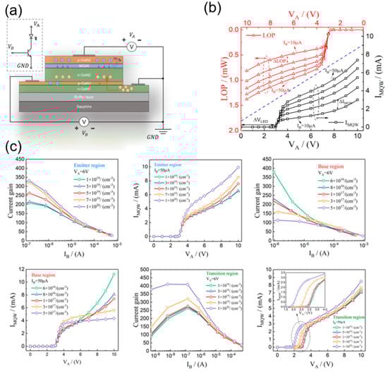 (a) Equivalent circuit and operating schematic of the device. (b) Output characteristics and optical output power characteristics of the device. (c) Current gain and output characteristics for different doping concentrations in the emitter, base, and transition regions [].