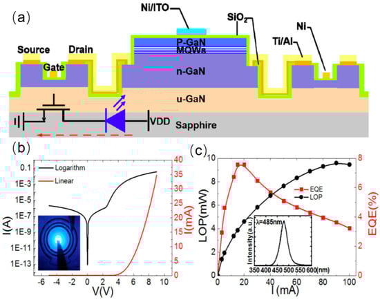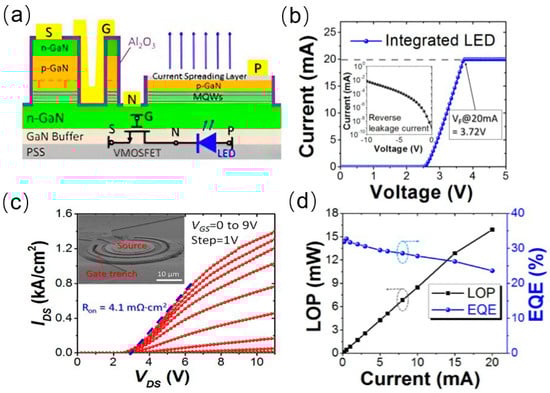 In 2014, a research team from National Taiwan Normal University fabricated MOSFET structures on exposed GaN layers, and connected LEDs in series as depicted in Figure 6a. An LED structure was grown on 2-inch sapphire substrates using a low-pressure metal–organic chemical vapor deposition system. The LED structure was then selectively removed by dry etching (ICP) with Ar/Cl2 mixed gases to expose the n-type GaN layer for the subsequent fabrication of MOSFET. Then, an n-type GaN layer on top of the MOSFET mesa was patterned by standard photolithography and ICP dry etching to give a film of 150 nm for the current channel []. The monolithically integrated MOSFET devices demonstrated excellent current injection capabilities and were capable of modulating the brightness of the LED by controlling the gate voltage. As can be seen from Figure 6b, the light output power of the LED rapidly increased at low injection currents (less than 20 mA) and reached saturation at higher injection currents (greater than 90 mA). In 2016, Xing Lu and colleagues from the South China University of Technology fabricated an integrated device combining MOSFET with an LED as shown in Figure 7a [], where they grew p-GaN and n-GaN on top of the LED to realize a p-n-p MOSFET structure. In the process of fabricating the MOSFET, tetramethylammonium hydroxide (TMAH) was employed to repair the sidewall damages of the MOSFET, thereby enhancing its electron mobility and achieving a high output current density exceeding 1.4 kA/cm2. The TMAH wet etch was found to be effective in removing damage from the dry-etched GaN sidewall. The I–V characteristic of integrated device indicates that the turn-on voltage is 3 V, and the on-resistance is 4.1 mΩ·cm. Under a forward injection current of 20 mA, the voltage of LED is only 3.72 V. The LED device exhibits a light output power (LOP) of 16 mW and a peak external quantum efficiency (EQE) reaching up to 33%.