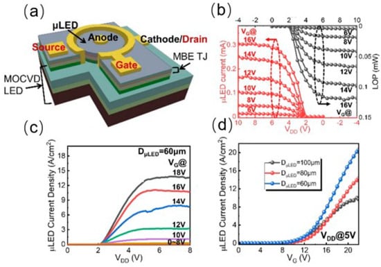 In 2016, Kazuaki Tsuchiyama and colleagues from Toyohashi University of Technology demonstrated an integrated device consisting of a silicon-based MOSFET combined with an GaN-based LED as depicted in Figure 8a []. They integrated a silicon-based MOSFET structure atop the LED device. They effectively suppressed thermal degradation of the Si-SiO2-GaN structure by optimizing the thickness of the silicon layer and process temperature, all without exceeding 900 °C. This ensured that the integrated component maintained good optoelectronic properties. The I–V curve shown in Figure 8b indicates that the threshold voltage is at 0.8 V, and the micro-LED exhibits an external quantum efficiency (EQE) of 6.5% with a turn-on voltage of 3 V. In 2023, Sang et al. from Nanjing University achieved monolithic integration of GaN-based MOSFET−LED on an LED chip as shown in Figure 9a []. The LED wafer was grown on a 2-inch c-plane patterned sapphire substrate by metal–organic chemical vapor deposition (MOCVD). The TJ typically replaces the indium tin oxide (ITO) to serve as a current-spreading layer for LEDs. Meanwhile, the LED and TJ stack present an n/p/n structure, which can also be used for a vertical MOSFET. They realized a stacked n-p-n structure through secondary epitaxial TJ junctions. The micro-LED and MOSFET were interconnected via a conductive n-GaN layer. By modulating the gate voltage, they effectively controlled the injection current into the micro-LED, thus achieving precise control of light output. Figure 9b presents the LOP (light output power) and I–V characteristics of the integrated device, where for a 60-μm micro-LED, the LOP is 0.12 mW (~4.2 W/cm2), and the current is 0.3 mA (approximately 10 A/cm2). In Figure 9c, the output curve of the MOSFET-LED integrated device exhibits a distinct turn-on threshold that differs from that of a single MOSFET device. Overall, the current density reaches up to 10 A/cm2, fulfilling the driving requirements for most micro-LED display applications. This study is based on 2-inch c-plane patterned sapphire and shows the possibility of industrial mass production.
