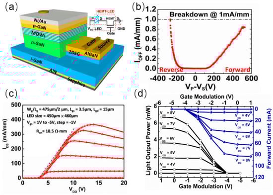 (a) Schematic of HEMT−LED device. (b) Forward-reverse breakdown voltage. (c) I–V characteristics of integrated HEMT−LED. (d) Gate bias modulation of optical output power [].
