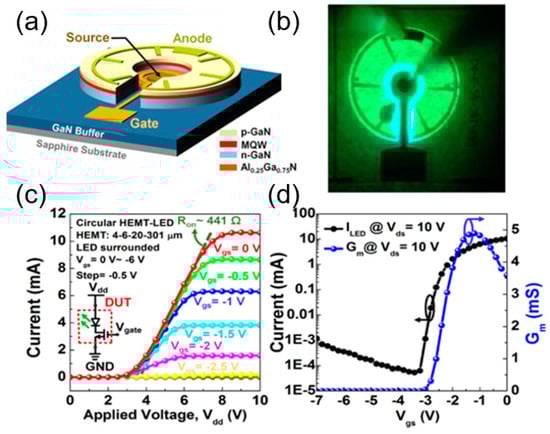 Different methods of integration will also bring different impacts on the device performance. In 2014, Liu et al. from Hong Kong University of Science and Technology fabricated HEMT-on-LED vertically integrated structures as shown in Figure 11a []. The AlGaN/GaN HEMT structure was grown on a 2-inch LED epitaxial wafer by MOCVD. The integrated device exhibited a peak transconductance of 244 mS/mm and a maximum output current of 920 mA/mm with an on-resistance of 2.58 Ω-mm. The turn-on voltage of the integrated LED was 3.1 V at an injection current of 10 mA. In 2018, Cai et al. from the University of Sheffield innovatively proposed a horizontally integrated circular HEMT-LED device, as shown in Figure 12a,b []. The n-GaN of the LED is connected with the two-dimensional electron gas channel of HEMT to achieve uniform green light emission at the wavelength of 507 nm. The circular structure has better current spreading, where the I–V characteristic shows that the turn-on voltage is ~3 V. The integrated LED can be driven and controlled well by adjusting the gate voltage of the HEMT. In 2019, Chen et al. from South China University of Science and Technology investigated vertically integrated HEMT-LED devices, as shown in Figure 13a,b []. An Mg doping process was applied to reduce the interconnect resistance. The output power can reach 80 mW under a forward voltage of 10 V. Its equivalent external quantum efficiency (EEQE) was measured to be 6.15% and the light output power per module area (LOPMA) of the integrated device was 12.5 W/cm2. This controllable and uniform emission will play an important role in full-color LED displays.