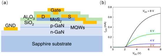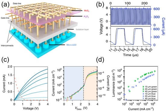 Typical TFTs cannot meet the increasing needs in micro-LED displays for high density integration and high current density. A new type of TFT is expected to offer a solution in high-resolution displays. Due to the good carrier mobility, crystal quality, and low temperature fabrication, MoS2 thin films have been adopted to enhance the electrical properties and current density of TFTs, an can be used as excellent micro-LED drivers. In 2021, Meng et al. from Nanjing University demonstrated an integrated device of MoS2 TFT-LED, as shown in Figure 14a []. The use of low-temperature ultra-clean growth of a high-quality MoS2 single-crystal film gives the TFT good electrical properties. In that work, the drive current of MoS2 TFT was 210 μA/μm with good uniformity. Therefore, the blue and green micro-LEDs are extremely bright as driven by the TFT with the gate voltage = supply voltage = bias = 8 V. The integrated device exhibited a response time of ~330 ns, with a single pixel running at 2.4 MHz, which can meet the demands of displays in TV screens, AR/VR, and smartphones. A high-resolution display with 1024 pixels was demonstrated at the system level, of which each pixel consists of one micro-LED and one MoS2-TFT.