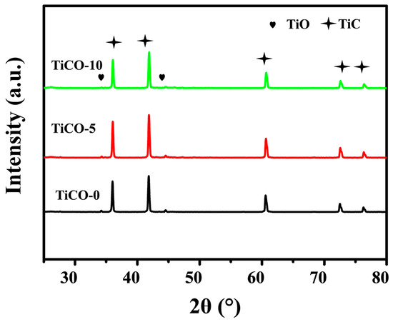 XRD patterns of the as-received TiCO ceramic with different catalyst contents.