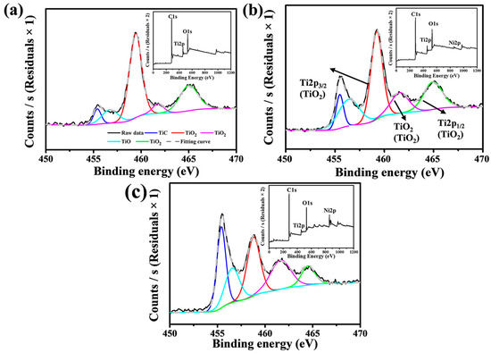 XPS of the samples was performed to further investigate the elemental composition. Figure 3 illustrates the peak decomposition of Titanium (Ti) elements. It is noticeable that the relative intensity of the Ti-C bond peak incrementally increases, while the Ti-O bond peak progressively decreases with an increase in the catalyst content. The trend of increase in TiC and decrease in TiO2 and TiO phase suggests a greater extent of the reaction between TiO2 and pyrolytic carbon as the catalyst content rises. When the Ni(NO3)2·6H2O content reaches 10%, TiO2 still persist in the sample. This indicates that under the current experimental conditions, TiO2 cannot be fully reduced to TiC. The components of the as-received porous ceramic include C, TiC, TiO2, and TiO; hence, it is denoted as porous TiCO ceramic.