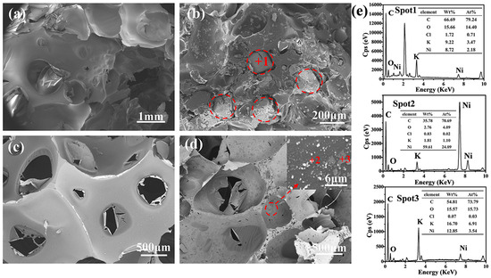 The morphologies of the monolithic resin and KCl/Ni(NO3)2·6H2O/resin precursors after being cured and sintered are shown in Figure 4. As seen from Figure 4a,c, the evaporation of anhydrous ethanol during curing leads to the formation of a porous carbon skeleton featuring pore sizes in the order of hundreds of micrometers. As seen from Figure 4b,e, KCl embeds within the phenolic resin and decomposes during the sintering process, resulting in larger pore sizes of hundreds and thousands of micrometers within the porous carbon skeleton compared to those derived from the monolithic phenolic resin. Consequently, the evaporation of anhydrous ethanol, along with the decomposition of KCl, contributes to the micro-scale pore formation within the porous carbon skeleton. Figure 4d,e illustrates that the K and Ni particles, resulting from the decomposition of KCl and Ni(NO3)2·6H2O, adhere to the surfaces of the pore wall. Ni(NO3)2·6H2O decomposes into NiO nanoparticle during the heating process. The formed NiO can be reduced to Ni particles by self-generated CO (g) derived from the carbothermal reduction process [34].