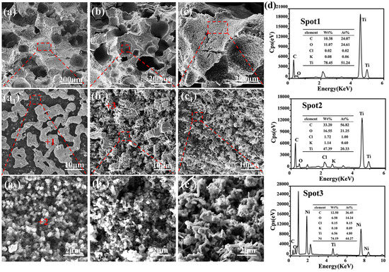 The microstructures of the received porous TiCO ceramic, with varying catalyst contents, are depicted in Figure 5. As observed from Figure 5, all samples exhibit both micro-scale and nano-scale pores. The micro-scale pores result from the volatilization of anhydrous ethanol and the decomposition of the KCl, while the nano-scale pores are formed by the gas release during carbothermal reduction. The micro-scale pore sizes of the three samples are all in the range of hundreds and thousands of micrometers. The amplification picture of the pore wall indicates its porous structure with nano-scale pores. The morphology of the pore walls strongly depend on the catalyst content. Upon examining Figure 5a,d, it can be deduced that TiC particles form due to the reaction of TiO2 particles and pyrolytic carbon on the surface of the pore walls in the absence of the catalyst. The pore walls of the TiCO-0 sample consist of white particles, which are evenly dispersed within a black honeycomb-like skeleton. In conjunction with the atom ratio in the EDS results, it is hypothesized that the white particles are TiO and the honeycomb-like skeleton are carbon. This suggests that a partial phase conversation from TiO2 to TiC occurs rather than a complete conversation in the absence of a catalyst. After adding Ni(NO3)2·6H2O, nickel melts into droplets at the elevated temperature and acts as nucleation sites for TiC grains, facilitating the dissolution of titanium and carbon sources into the droplets. Subsequently, this process promotes unidirectional growth of TiC whiskers and results in a greater reduction in TiO2 to TiC, thus decreasing the amount of carbon skeleton. This accelerative carbothermal reduction leads to the formation of a porous structure, characterized by rod-shaped TiC whiskers that interconnect both on the surface and within the pore walls. However, when the Ni(NO3)2·6H2O content is further increased to 10%, excessive nucleation sites lead to the agglomeration of TiC grains, which results in pore wall structures with larger pore sizes and less carbon skeleton. Based on this analysis, it can be concluded that Ni(NO3)2·6H2O catalyst content primarily influences the pore wall structure of the porous TiCO ceramic.