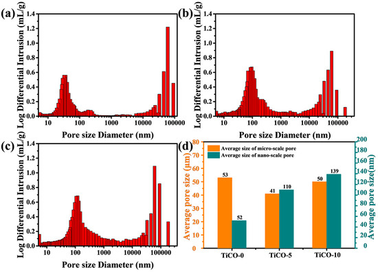 Figure 6 presents the pore-size distribution curves for samples with varying catalyst contents. The porous TiCO ceramic depicted in Figure 6 demonstrates a dual modal pore-size distribution, consisting of nano-scale pores and micro-scale pores. To clarify the effect of catalyst content on the pore structure of the porous TiCO ceramic, the average pore size of a micro-scale pore and nano-scale pore were calculated and presented in Figure 6d. As seen from Figure 6d, the average nano-scale pore size increased from 52 to 139 nm while the average micro-scale pore size minorly changed as the catalyst content increased. The nano-scale pore formation is attributed to the release of CO gas during carbothermal reduction, as mentioned previously. The extent of carbothermal reduction is influenced by the concentration of the catalyst. An increase in catalyst content leads to a higher degree of carbothermal reduction, and consequently, a larger size of nano-scale pores. These results agree with the SEM results, showing that the number and size of the nano-scale pore of the porous TiCO ceramic are obviously adjusted by changing the catalyst content.