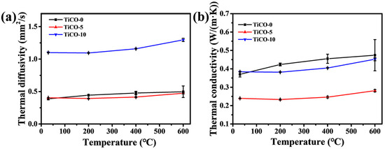 Figure 8a,b shows the thermal diffusivity and thermal conductivity of the as-received porous TiCO ceramic at room temperature and elevated temperatures, respectively. It can be seen from Figure 8a that porous TiCO ceramic with different catalyst content exhibits a low thermal diffusivity from 0.388 to 1.1 mm2/s at room temperature and a slight increment at elevated temperatures. As is well known, the heat conduction of the sample consists of three parts: solid heat transfer, gas heat transfer and radiation heat transfer. Generally, solid heat transfer could be decreased by the larger porosity and reduced solid contact area, and gas heat transfer can be lowered through controlling the pore size less than the average white path of gas molecules of 70 nm. The radiation heat transfer is proportional to the temperature. As the catalyst content increases from 0 to 5%, the porosity of the samples increases from 63% to 75%, while thermal conductivity decreases from 0.38 to 0.25 W/(m·K). This trend aligns with the conclusion drawn from numerous studies [6,7,14,15,21,35,37], which state that thermal conductivity is inversely proportional to the porosity of ceramics. When the catalyst content increases to 10%, the sample’s porosity further rises to 82%, and its thermal conductivity increases to 0.4 W/(m·K). This increase may be attributed to the formation of TiC whiskers, which create a solid-phase bridge across the pores, enhancing the solid heat transfer path. The thermal conductivities of the TiCO-0, TiCO-5, and TiCO-10 samples increase by 28%, 17%, and 18%, respectively, as the testing temperature rises from 25 °C to 600 °C. The primary cause of the increase in thermal conductivity with temperature is the enhancement of radiative heat transfer through the solid phase, which increases as the cube of the temperature [38]. The small, average nano-scale pore size of 52 nm in the TiCO-0 sample results in more solid-phase transfer paths, leading to a greater increase in thermal conductivity as the temperature rises. By adding the 5% and 10% catalyst, the reaction between pyrolytic carbon and TiO2 is enhanced, resulting in larger average nano-scale pore sizes of 110 nm and 139 nm, thereby reducing the solid-phase transfer path and diminishing the increase in thermal conductivity at elevated temperatures. Owing to the low density and thermal diffusivity, the TiCO-5 sample presents the lowest thermal conductivity among the three samples.