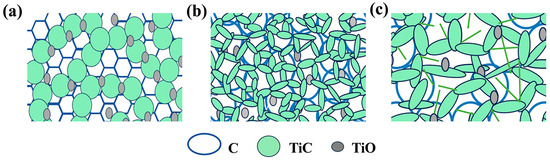 The schematic illustration of the pore wall of the porous TiCO ceramic: TiCO-0 (a), TiCO-5 (b), TiCO-10 (c).