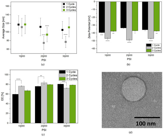 Characterization of Lipo-C formulations obtained by treatment at three different HPH pressures and cycles (a) particle average size; (b) zeta-potential; and (c) vitamin C EE%; (d) TEM image of Lipo-C obtained at optimal HPH process parameters (Lipo-C-20). The experiments were analyzed by one-way ANOVA, * p ≤ 0.05, ** p < 0.01, *** p < 0.001, and **** p ≤ 0.0001; n = 3.