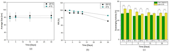 Effect of storage conditions of Lipo-C-20 over 1 month in the dark at 4 °C and 25 °C on (a) particles average size; (b) RR % of vitamin C; and (c) DPPH scavenging activity of Lipo-C-20 compared to a free vitamin C solution. The experiments were analyzed by two-tailed Student’s t-test, ** p < 0.01 and *** p < 0.001; n = 3.