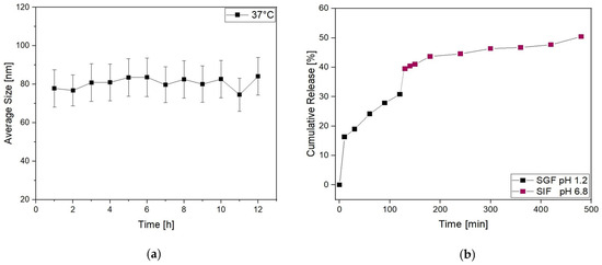 Physical stability of liposomes is expressed as (a) the average size and standard deviation of Lipo-C-20 observed after overnight incubation in PBS at 37 °C; (b) release profile of Lipo-C-20 in a simulated GIF expressed as cumulative release % of vitamin C from liposomes incubated 2 h in SGF pH 1.2 and then additional 6 h in SIF pH 6.8.