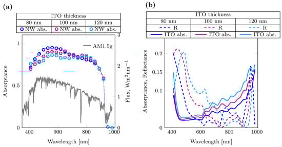 Using the absorptance spectra, the photocurrent density was calculated using Equation (1) and resulted in 29.4 , 28.8 and 28.1 for 80 nm, 100 nm, and 120 nm ITO thickness, respectively. Therefore, the reduction in reflection and parasitic absorption across the visible spectrum for decreased ITO thickness directly corresponds to increased photocurrent density.
