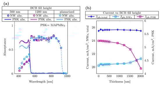 BCB fill height optimization (a) absorptance profiles for different BCB thicknesses 500 nm (dotted blue line), 1200 nm in (dotted magenta line) and planarized in (dotted cyan line), corresponding to a fill height of 1975 nm. (b) Current behavior for different BCB fill heights. NWs and total photocurrents (diamond blue marker and cyan square marker) refer to the left y-axis, and perovskite photocurrent (magenta square marker) to the right y-axis.