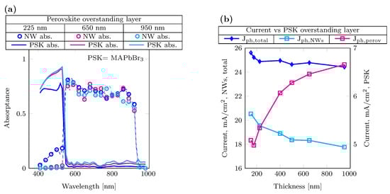 Variation of perovskite thickness. (a) Absorptance for different perovskite overstanding layer thicknesses on top of the NWs: 225 nm in blue, 650 nm in magenta and 950 nm in cyan. (b) Current behavior for different perovskite overstanding layer thicknesses. NWs and total photocurrents (diamond blue marker and cyan square marker) refer to the left y-axis, and perovskite photocurrent (magenta square marker) to the right y-axis.