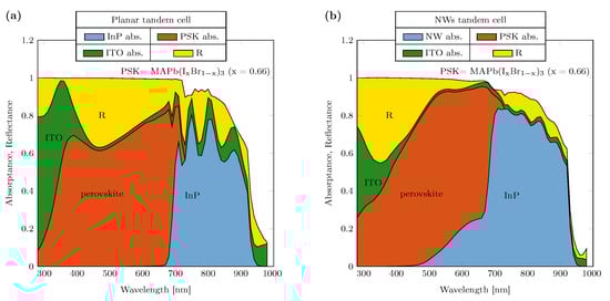 Absorptance of 2T devices for (a) planar tandem architecture. The perovskite and InP thicknesses are respectively 1500 nm and 2000 nm. (b) NWs tandem architecture. Perovskite overstanding layer thickness = 250 nm, InP NWs diameter = 240 nm length = 2200 nm.