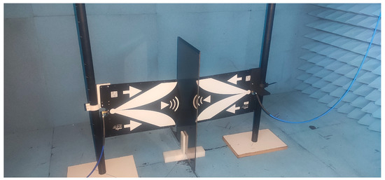 The experimental setup for RF measurements (Figure 1) used two directional Vivaldi antennas (TSA600, RFSPACE, Atlanta, GA, USA) operating within the 600–6000 MHz frequency range and placed in an anechoic chamber. Signal generation and measurements were carried out using a vector network analyzer (picoVNA 106, Pico Technology, Cambridge, UK).