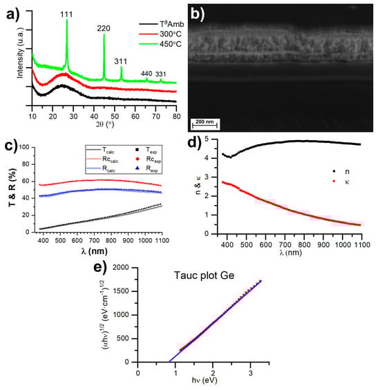 (a) XRD of Ge thin films; (b) FESEM image of five-layer coating made of Ge and SiAlNx; (c) spectrophotometric measurements of a 28 nm thin film of Ge and its calculated fitting using the found complex refractive indices; (d) complex refractive index of Ge thin films; and (e) Tauc plot of amorphous Ge thin films.
