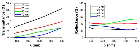 Once the complex refractive indices were obtained, we simulated the optical properties of thin films of amorphous germanium with different thicknesses, as shown in Figure 3. We can observe how the transmittance of the thin germanium layers increases with the wavelength, meaning that they transmit blue colors to a lesser extent than red ones. Consequently, simple structures containing germanium will appear reddish during transmission. This is an expected result since the imaginary part of the refractive index (related to absorption) increases as the wavelength decreases. Additionally, in Figure 3, we can also observe the reflectance spectra (from the substrate side) for the germanium samples of different thicknesses. For the thin ones, the reflectance increases uniformly for all the wavelengths until it reaches a value of 40% for the 20 nm thick layer. As we continue to increase the thickness of the layer, it stabilizes around 37% between 400 and 500 nm, while for longer wavelengths, there are certain “oscillations” in the reflectance values. This is because the reduced absorbance of germanium at these wavelengths allows for the interference of the reflected amplitudes at both interfaces of the germanium layer. Thus, the reflectance values are high when this interference is constructive and low when it is destructive. This effect was also observed to a lesser extent in the transmittance curves. For example, the 70 nm thick layer has the same transmittance as the 40 nm thick layer for a wavelength of 800 nm. This is because, in the 70 nm thick germanium layer, the interference produced is constructive during transmittance but destructive during reflectance (hence, it has lower reflectance than the 40 nm thick layer does).
