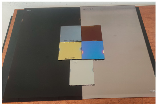 Decorative coatings with various aesthetic appearances have been developed. These coatings are categorized into three types: metallic gray, black, and colored ones. All these decorative coatings have been fabricated using alternating thin layers of SiAlNx and Ge, precisely adjusting the thickness of each layer to control their optical properties. Precision is crucial because these properties are determined by the optical interference resulting from the multilayer structure. Figure 4 displays an image featuring different deposited coatings, including two large samples measuring 520 mm × 300 mm (Black and metallic gray) and several smaller ones measuring 100 mm × 100 mm.