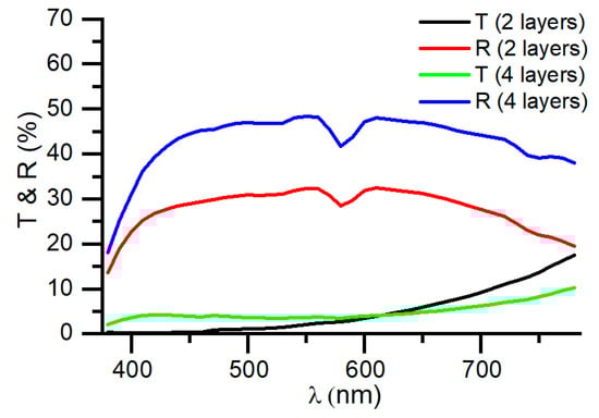 Transmittance and reflectance of two-layer and four-layer gray metallic coatings.