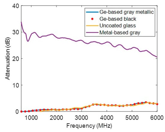 Radiofrequency attenuation of uncoated glass, gray and black (Ge-based one), and metallic coatings (metal-based one).