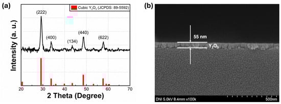 Figure 1a displays the obtained GIXRD data from the annealed Y2O3 films. The diffraction peaks detected at 2θ values of 29.17°, 33.81°, 43.51°, 48.56°, and 57.66° are consistent with the Y2O3 crystallographic planes of (222), (400), (134), (440), and (622), respectively, confirming that the film has a polycrystalline structure. Through the most conspicuous peak at 29.17°, it can be deduced that grain growth dominantly occurred along the (222) plane direction. According to the GIXRD results, the observed peaks align well with the Y2O3 cubic structure (JCPDS: 89-5592), which is stable at relatively low temperatures [24]. Using the following Scherrer equation, the crystal size was computed: