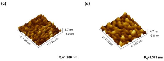 where D, λ, β, and θ denote the average crystal size, X-ray wavelength (1.54 Å), the full width at half maximum, and Bragg angle, respectively. The calculated crystal size of the Y2O3 films at the (222) plane was 10.97 nm. The surface roughness of the deposited Y2O3 films was obtained using SPM. The three-dimensional SPM surface image of the annealed film sized at 1 µm × 1 µm is presented in Figure 1b. The measured root-mean-square surface roughness (Rq) for the films was 1.322 nm.