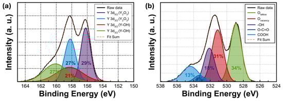 The chemical composition of the films was examined via XPS analysis. The acquired data were calibrated using the C1s peak at 284.5 eV. Figure 2a shows the Y3d peak, which consists of a doublet split into Y3d5/2 and Y3d3/2 states, located at 156.2 and 158.2 eV, respectively. This clearly indicates the formation of a Y–O bond. However, Y–OH bonds in the bulk of the film were also detected [25]. The O1s core-level spectra are presented in Figure 2b. The XPS peaks corresponding to pure Y (binding energies: 155.98 and 157.99 eV) did not appear [26]. The prepared precursors were successfully converted into Y2O3, not including any Y. These results also match well with the GIXRD data. The O1s spectra deconvoluted into five features at 528.9, 531.1, 532.1, 533.3, and 534.4 eV. The peaks are associated with M–O bonding in the Y2O3 lattice (OL), oxygen vacancy (OV), hydroxyl groups representing oxygen that is bound to the surface (–OH), O–C=O, and COOH, respectively [27,28]. When evaluating the relative area percentages of each component to the total area, the proportions of OL and OV are elucidated as 34% and 31%, respectively.