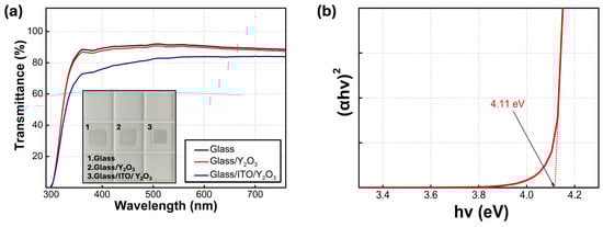 Figure 3a shows the transmittance of the glass, glass/Y2O3, and glass//ITO/Y2O3 films. The optical transparency of glass/Y2O3 films reaches 87% in the visible light region, extending from 400 to 700 nm in wavelength. The transmittance spectrum of the cleaned glass sample and glass/Y2O3 films are almost identical in the visible range, implying that sol–gel-processed Y2O3 films have a sufficient transparency. The remarkable transparency is attributed to almost negligible absorption losses, indicating the effective applicability of Y2O3 in electroluminescent applications. In contrast, the spectra of the glass/ITO/Y2O3 films exceed 76% in the visible light region. The decreased transmittance in the visible light region from 400 to 700 nm originates from the ITO BEs [29]. As the film thickness increases, the absorption increases. In these reasons, the transmittance spectrum of the cleaned glass sample and glass/Y2O3 films are almost identical in the visible range, due to the thin Y2O3 films. In contrast, in the case of glass/ITO/Y2O3 films, thick ITO films lead to a decreased transmittance [30,31]. The optical band gap was determined by graphically representing (αhν)n as a function of hν and performing linear fitting on the plotted graph. As shown in Figure 3b, the plot is derived using Tauc’s relation as follows:
