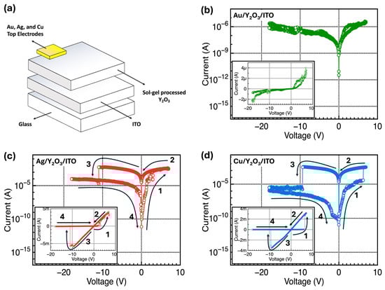 (a) Schematic of the fabricated Y2O3-based RRAM devices and (b–d) representative I–V curves of the Y2O3-based stacked-structure RRAM devices with different TEs.