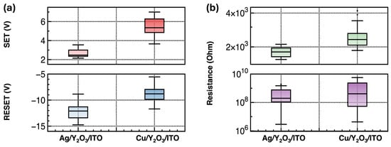 Until now, several efforts have been made to push flash memory technology to its physical downscaling limit. Extremely downscaled devices show low power consumption and high performance, and can also enable the realization of a highly integrated system for future applications. However, they can face limitations [1]. To resolve these matters, resistive random-access memory (RRAM) devices have been considered a promising candidate to replace conventional flash memory as a next-generation memory model [2,3,4,5]. This is because they have an uncomplicated metal–channel–metal structure, a destruction-free readout, fast operation, low energy consumption, and high endurance. Many promising metal oxides have been explored as active main channel materials between two electrodes, such as SiOx, ZrO2, TiOx, HfxO, and Y2O3 [6,7,8,9,10,11]. Among them, Y2O3 plays an important role due to its promising properties such as its large dielectric constant (k = 14–18) and optical bandgap (Eg = ~5.5 eV). These properties make Y2O3 useful as high-k insulators in complementary metal–oxide–semiconductor (CMOS) processes with low-k SiO2 insulators [12,13]. In addition, good chemical, mechanical, and thermal stability renders Y2O3 a potential candidate for surface coating layers in harsh environments [14]. Its high refractive index (n = 2.1) can make it a waveguide in solid state lasers [15,16]. Particularly for RRAM devices, Y2O3 has high defect chains along preferred orientations, which is helpful for easily forming the conductive filament, and leads to forming process-free RRAM devices [17,18]. There are two types of RRAM corresponding to conductive filaments between two electrodes: oxygen vacancy-based conductive filament-based OxRRAM and conductive-metal-bridge-filament-based conductive bridging random access memory (CBRAM) [19,20,21]. In the case of CBRAM, to form the conductive metal filament, active metal top electrodes (TEs), such as Cu, are used. This is more advantageous for integrated circuits in the CMOS industry because it suppresses the electron migration or resistor-capacitor (RC) delay compared to OxRRAM [22,23]. In the case of CBRAM, electrodes exhibiting electrochemical activity, such as Ag or Cu, and those that are electrochemically inert, such as Au or Pt, are utilized. The conductive filaments are formed via electrochemical reactions and diffuse inside the active RRAM channel materials. Finally, the reformation process occurs at the electrochemically inert bottom electrodes (BEs) from diffused metal ions. From that moment, conductive metal filaments grow from the inert electrodes. By making a short circuit between two electrodes, the resistance state changes from the high-resistance state (HRS) to the low-resistance state (LRS). The formed conductive metal filaments are broken via applying a negative voltage to the reduction process, which is slightly assisted by Joule heating. Finally, the HRS is attained. Electrochemically active electrodes have their own physical and electrochemical properties, such as oxidation rate, the number of generated mobile metal ions, migration speed, and the redox rate at the electrochemically inert BEs. Therefore, different electrochemically active electrodes can affect RRAM characteristics, such as the SET and RESET voltages, HRS and LRS values, endurance, and retention.