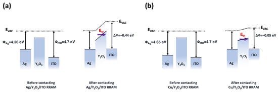 Energy diagrams for (a) Ag/Y2O3/ITO and (b) Cu/Y2O3/ITO RRAM devices, before and after contact.