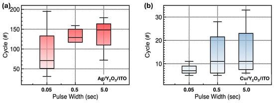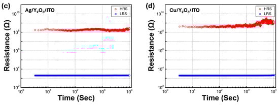 As shown in Figure 7a–d, the properties of the nonvolatile RRAM devices were assessed as a function of the pulse width (0.05, 0.5, and 5 s) via measuring the endurance and retention performance at a read voltage of 0.1 V. For programming and erasing, +7.0 and −18.0 V were applied, respectively. As the pulse width increases, the fabricated Y2O3 RRAM devices have sufficient time for the oxidation process at the TEs and Y2O3, as well as to migrate to the inert BEs for each cycle. The obtained average number of cycles increases from 99 to 133 for the ITO/Y2O3/Ag RRAM devices and from 7 to 15 for the ITO/Y2O3/Cu RRAM devices. However, at this average number of cycles under the same biased pulse width condition, the ITO/Y2O3/Cu RRAM devices show worse endurance properties, which originate from the slow migration speed. This makes it difficult to form the conductive filament during the programming process. A larger voltage or a longer pulse width may be required to form the conductive filaments for the ITO/Y2O3/Cu RRAM devices. In contrast, the retention data in the two cases indicate that the resistance states remained stable up to 104 s without significant degradation. Compared to the modern devices, still operation voltages are high, and endurance and retention properties are relatively poor. OV concentration control in metal oxides or local electric field generation help to reduce the operation voltage and enhance endurance and retention properties by suppressing randomly formed conductive filaments. These strategies are needed to improve device performance [42,43].