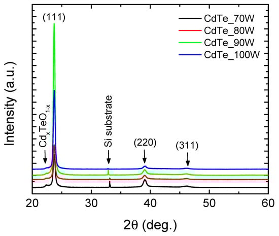 The predominant growth direction of CdTe nanocrystallites on the (111) plane in GIXRD spectra may be attributed to the comparatively lower surface energy on this plane compared to the (220) and (311) planes. This discrepancy could stem from an augmented diffusivity of atoms in the substrate []. As the RF power increases, there is an observable rise in the intensity of the (111) peak, indicating an enhancement in crystallinity within the CdTe films. Concurrently, the peaks associated with the (220) and (311) crystalline planes demonstrate a decrease.