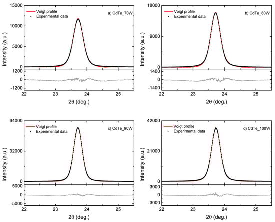 Deconvolution using Voigt profiles of the (111) diffraction peak corresponding to (a) CdTe_70W; (b) CdTe_80W; (c) CdTe_90W; and (d) CdTe_100W deposited by RF–magnetron sputtering on a p-Si substrate. The peak XRD profiles were recorded in Bragg–Brentano theta–theta geometry. The experimental data have been processed with the Voigt function, and the associated residual is shown at the bottom of each graph.