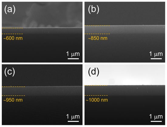 Morphological investigations of the CdTe nanostructured thin films deposited by RF–magnetron sputtering on p-Si substrates were also carried out in terms of SEM cross-sectional analysis in secondary electron (SE) mode imaging. Figure 4 highlights that all sputtered CdTe nanostructured thin films at different working RF powers are compact and suggests quite conformal growth on the p-Si substrate.