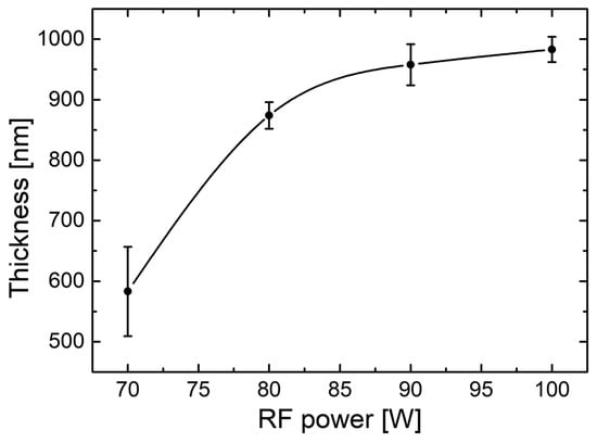 Variation in CdTe nanostructured thin films’ thickness as a function of RF plasma power, under the manufacturing sputtering conditions specified in the text.