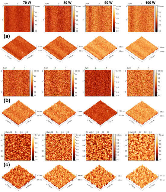 Cross-section SEM morphological investigations can be combined with the AFM technique in order to achieve a complete view over the CdTe nanostructured thin films’ growth quality. The surface topographies of the CdTe nanostructured thin films deposited at different RF powers were analysed by AFM in non-contact mode. Figure 6 shows the 2D and 3D AFM images of the surface topography of the CdTe nanostructured thin films sputtered at different RF powers. The AFM scanned areas for each sample were as follows: 1 µm2 (upper row); 5 µm2 (middle row); and 10 µm2 (lower row), acquired in order to provide insight into the films’ surface quality, at lower and larger scales, respectively. As one can observe from the AFM images, the polycrystalline nature of the CdTe nanostructured thin films is confirmed by the granular structure of the surface, consisting of grains with sizes in the order of tens of nanometres. The average size of the surface grains is obviously in agreement with the crystallites’ size variation observed from the GIXRD data analysis. The grains present on the CdTe film obtained from the deposition at 80 W RF power show the smallest size and the highest z-range, although the surface RMS seems to increase with an increasing RF sputtering power. Also, it can be observed that the film grown at 100 W RF power shows a smoother surface and a more uniform surface grain size distribution than the film obtained from the 90 W for power growth. This observation remains valid at a low scan size as well as at a high scan size for all CdTe nanostructured thin films (Figure 6).