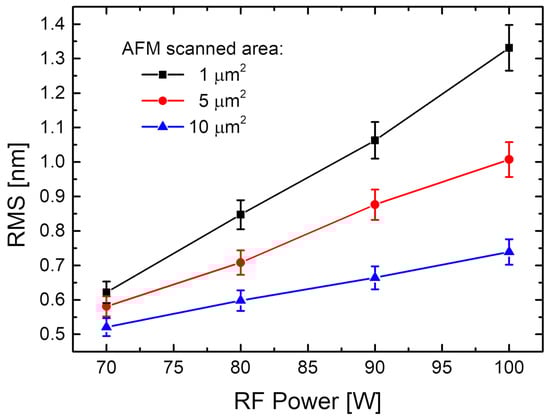 For a better understanding of the surface morphology from AFM characterisation, the surface roughness morphology parameters, surface roughness, and statistical parameters such as the skewness parameter (Ssk)—which is a third-order statistical parameter—were used to describe how symmetric a statistical distribution is (one can have an almost perfect Gaussian distribution if the statistical distributions have Ssk values close to zero) and the kurtosis parameter (Sku)—a fourth-order statistical parameter used to describe how sharp or how broad a statistical distribution is (one can have broader distributions if the values are below 3 or sharp distributions in the case of values above 3) []—was estimated. All these parameters were evaluated using specialised open-source software for scanning probe microscopy data processing (Gwyddion). As can be seen from Table 3, the root-mean square (RMS) roughness values for all the RF-sputtered CdTe nanostructured thin films deposited on p-Si substrates at different working powers are relatively low and increase when the RF power increases. This behaviour was also observed in a plot of RMS roughness as a function of the RF power (Figure 7).