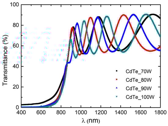 The optical properties of CdTe nanostructured thin films deposited on optical glass substrates were investigated by optical transmission and absorption spectroscopy. All the spectra were recorded at room temperature. Optical transmission spectra were taken ranging from 400 to 1800 nm in wavelength and are presented in Figure 8. Transmission values higher than 65% can be observed in the 800–1800 nm region, confirming excellent transmittance properties to be employed as an absorber layer.