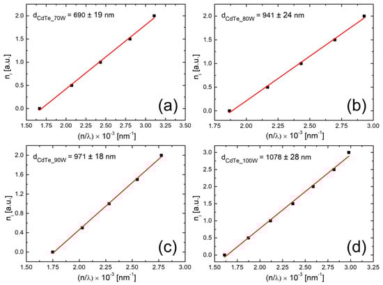Determination of thicknesses corresponding to CdTe nanostructured thin films sputtered onto optical glass substrates at the RF plasma power of 70 W (a), 80 W (b), 90 W (c), and 100 W (d).