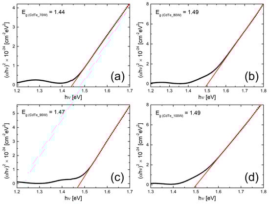 where A is a constant, α is the absorption coefficient, h is the Plank’s constant, υ is the frequency of radiation, and Eg is the optical band gap corresponding to the Γ point of the first Brillouin zone. As one can see from Equation (3), n is an exponent that is dependent on the transition type (in the case of CdTe nanostructured thin films, n = 1/2 because it corresponds to a direct allowed transition).
