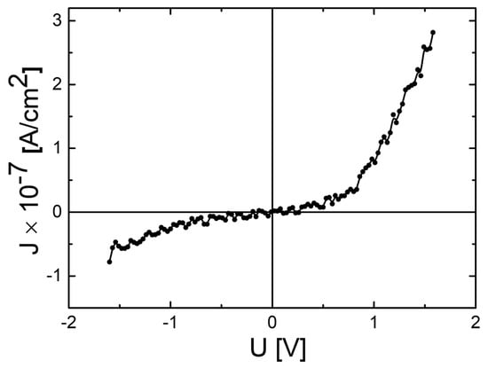 Current density–voltage (J-V) dark ambipolar characteristic recorded at a temperature of 316 K, for the Ag/CdTe/Al “sandwich” structure.
