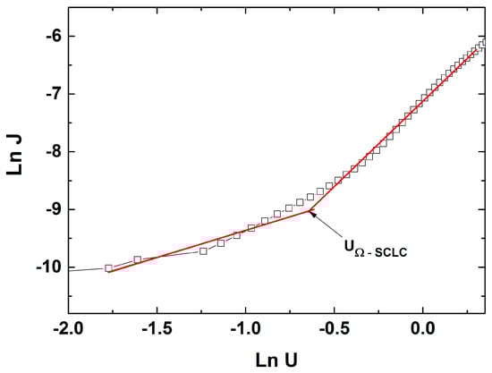 To understand the charge transport mechanism through the Ag/CdTe/Al structure and to observe the presence of different conduction mechanisms along the same type of bias, in Figure 12, the forward bias (J-U) characteristics were plotted in a logarithmic scale. Choosing the most experimental points from a range of voltages for the linear regressing fit in such a way that the coefficient of regression would be higher than 0.9, two straight lines were obtained with different slopes. As one can see, two straight lines with different slopes emphasizing two regions were obtained, each related to a corresponding charge transport mechanism. For the first region, at low injection levels (low applied voltages), the slope of the linear plot is near unity (0.93); therefore, it shows a typical ohmic conduction mechanism, assured by the equilibrium charge carriers. For the region at high injection levels (high voltages), above the defined transition voltage (UΩ-SCLC = 0.53 V), the slope is almost 3 (2.96), indicating a conduction mechanism based on space-charge-limited conductivity (SCLC) in the presence of an exponential trap distribution. The latter conduction mechanism is generally encountered in semiconducting materials with a low carrier mobility, thus having a high resistivity, usually AII–BVI compounds such as CdS [], ZnTe [], and CdTe []. The fitting of experimental data was carried out following the relationships describing these two conduction mechanisms [,].