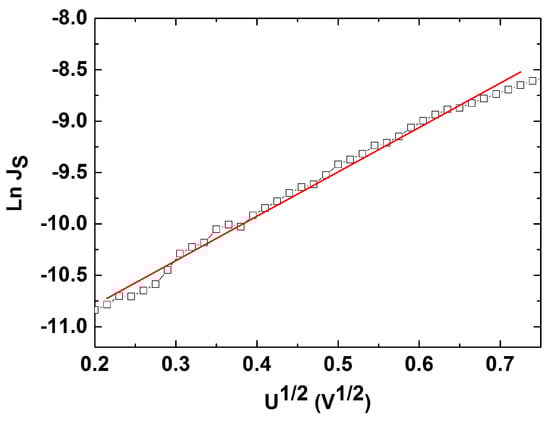 When applying a reverse bias (the third quadrant from Figure 11), the dominant transport mechanism through the Ag/CdTe/Al structure is based on the Schottky effect at a barrier potential. In this situation, the current density obeys the following law: