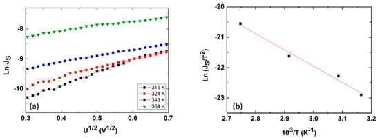 (a) Logarithmic JS vs. U1/2 characteristics recorded at four temperatures, 316K, 324K, 343K, and 364K, that allowed the evaluation of the Schottky barrier at the Al/CdTe interface as by using the displayed (b) dependence of .